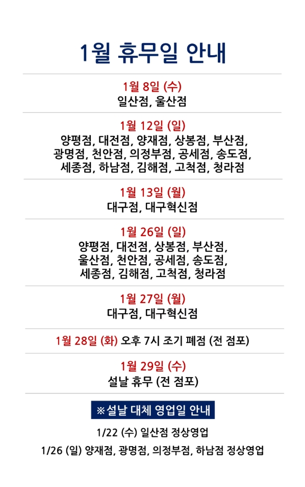 2025년 1월 전 매장 휴무일은 다음과 같다.